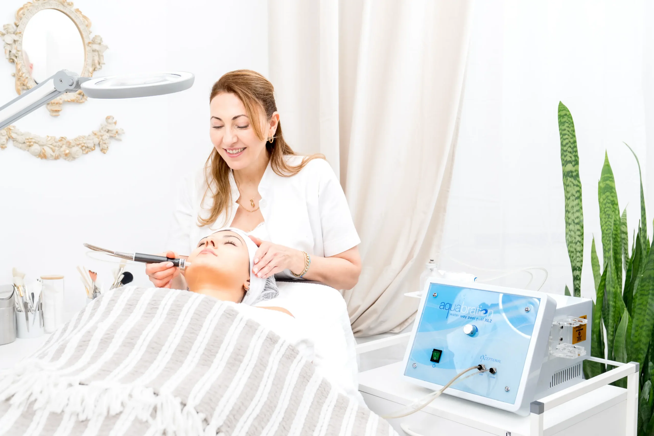 Aquabration – ein auf Wasserdruck basierendes sanftes Peeling löst Altmacher, Unreinheiten, Verhornungen und Ablagerungen von der Haut. Diese Behandlung eignet sich für alle Hauttypen und unterstützt die Glättung von Narben und großporiger Haut.